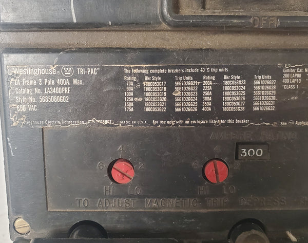 Westinghouse TRI-PAC LA3400PRF 400A 600V 3 Pole Circuit Breaker